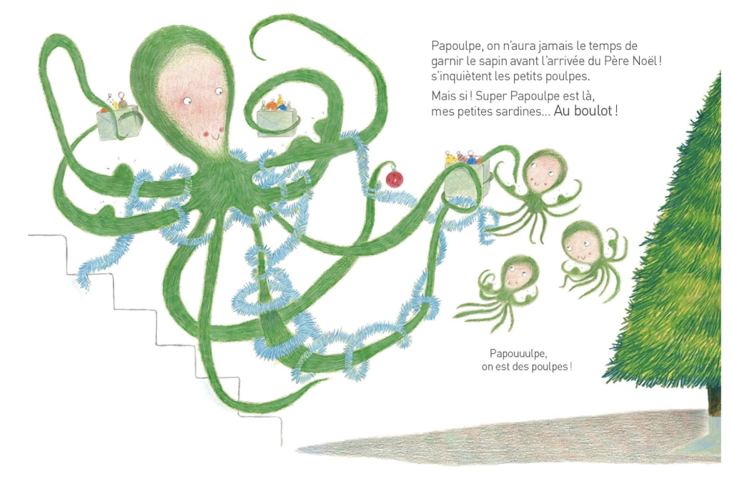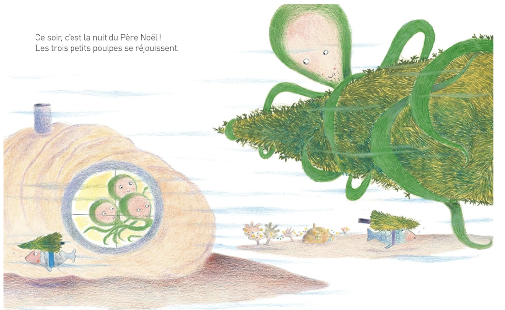 Ce soir, c’est la nuit du Père NoĂ«l ! Les trois petits poulpes se rĂ©jouissent. Papoulpe a ramenĂ© le sapin. C’est parti pour la dĂ©coration ! Qui trouvera la flèche dans les tentacules de Papoulpe ? Tout est prĂŞt, le Père NoĂ«l peut venir. « Il vient en sous-marin ? » demandent les petits poulpes.