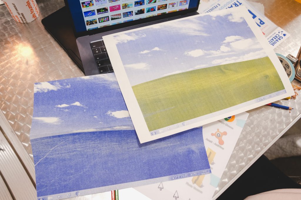Du côté numérique, plusieurs projets ont ravivé l’esthétique des années 2000. Des impressions inspirées du fond d’écran « Bliss » de Windows XP — cette colline verdoyante à l’aspect irréel mais bien réelle — recréent l’atmosphère des jeux Flash disparus et d’un internet pré-réseaux sociaux. La mise en page numérique souligne le dialogue entre outils digitaux et fabrication artisanale.