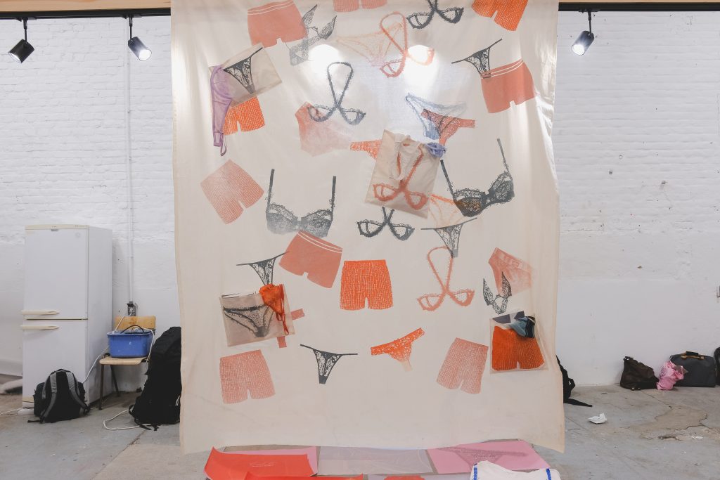 L’atelier textile, autour des sous-vêtements, mêle impression sur tissu, motifs répétitifs et sérigraphie, questionnant la variété de forme du linge de corps.