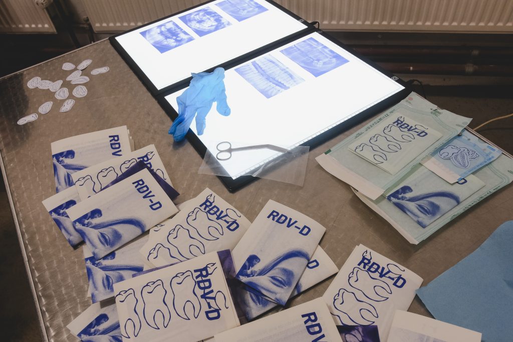 RDV-D détourne l’imagerie médicale et dentaire, questionnant la représentation du corps et la reproduction mécanique des images.