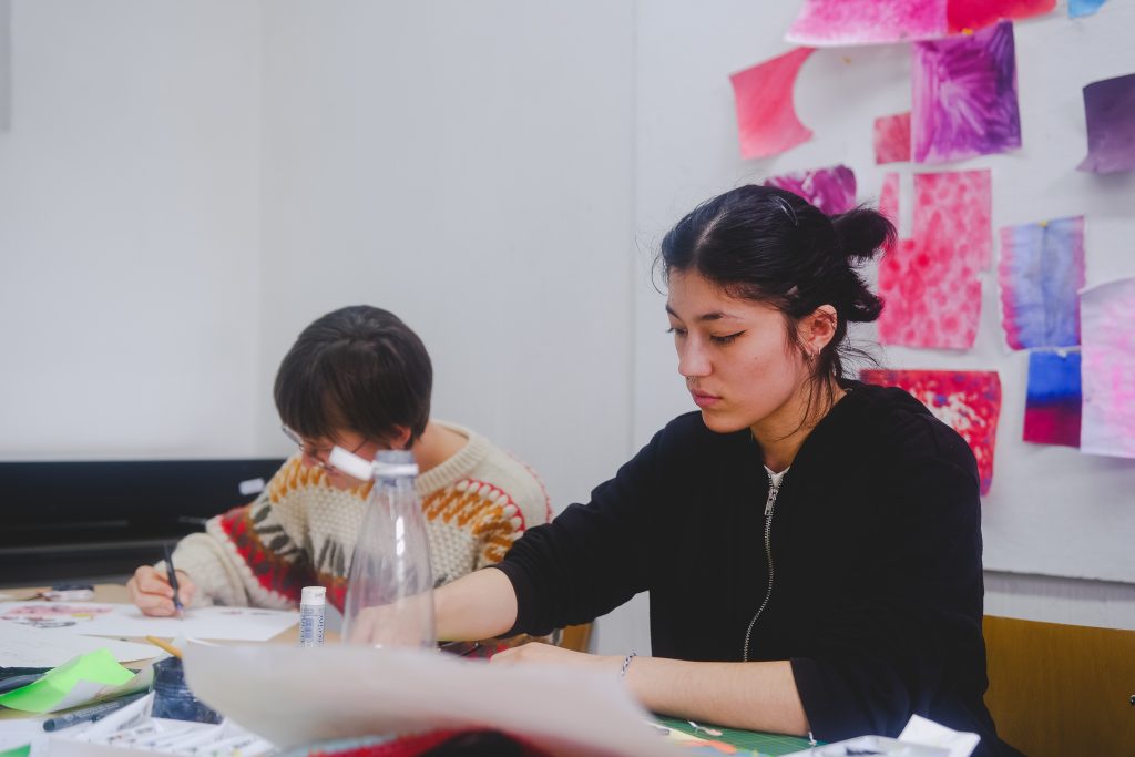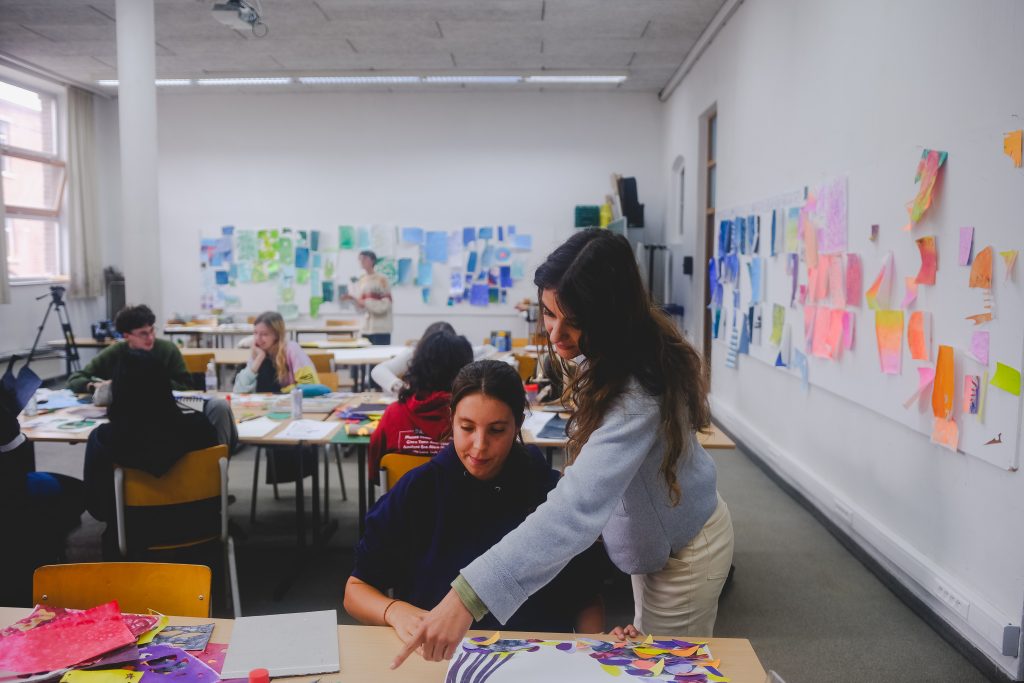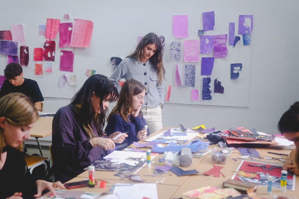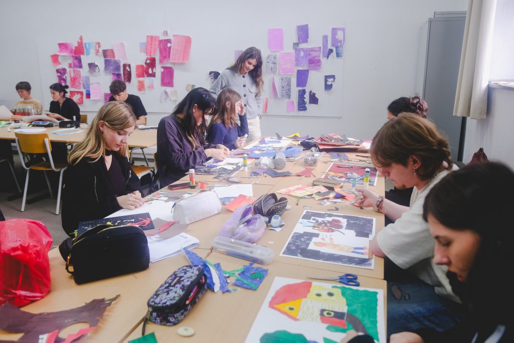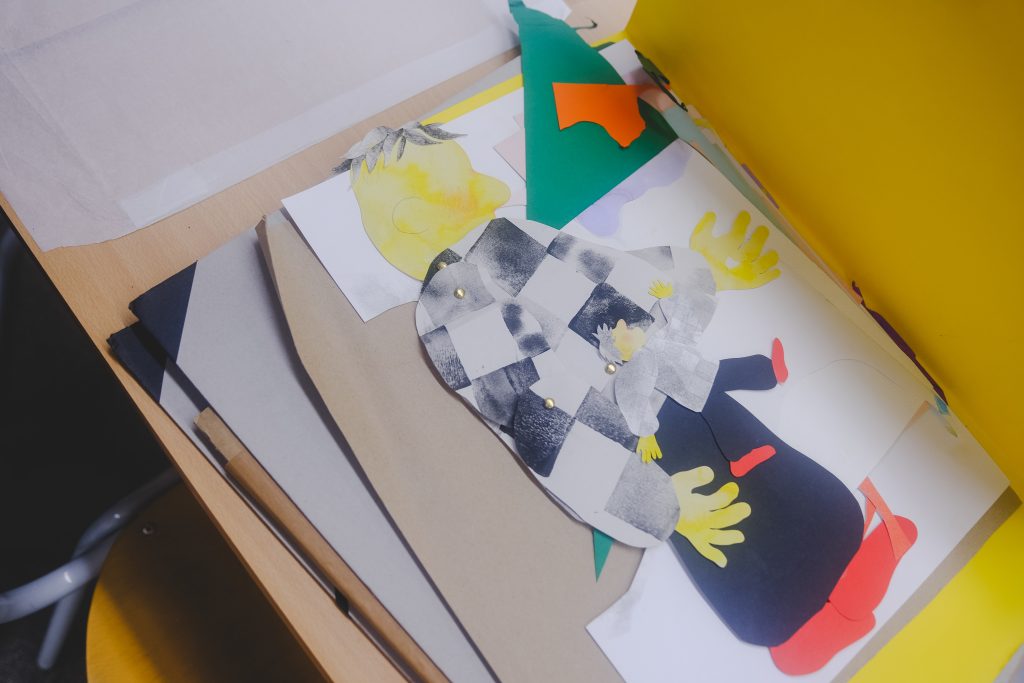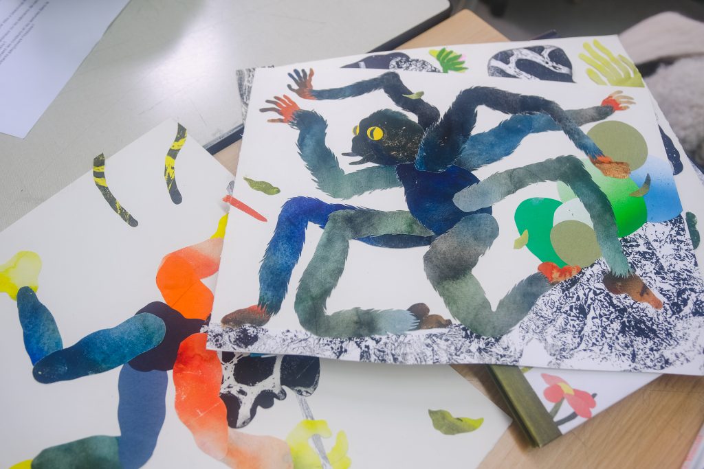 Tout au long de ces deux jours, elle a invité les étudiant·e·s à explorer la technique du papier découpé, cœur de son univers graphique et utilisée dans ses albums jeunesse (Bonjour bébé) ainsi que dans ses spectacles vivants et installations scénographiques. L’exercice consistait à imaginer, composer et réaliser une image narrative en une journée, guidée par la composition, l’instinct et la liberté offerte par l’assemblage des formes et des couleurs. Cet atelier a permis de réfléchir à l’équilibre entre forme, synthèse et narration, tout en éveillant le plaisir ludique et tactile de la création.